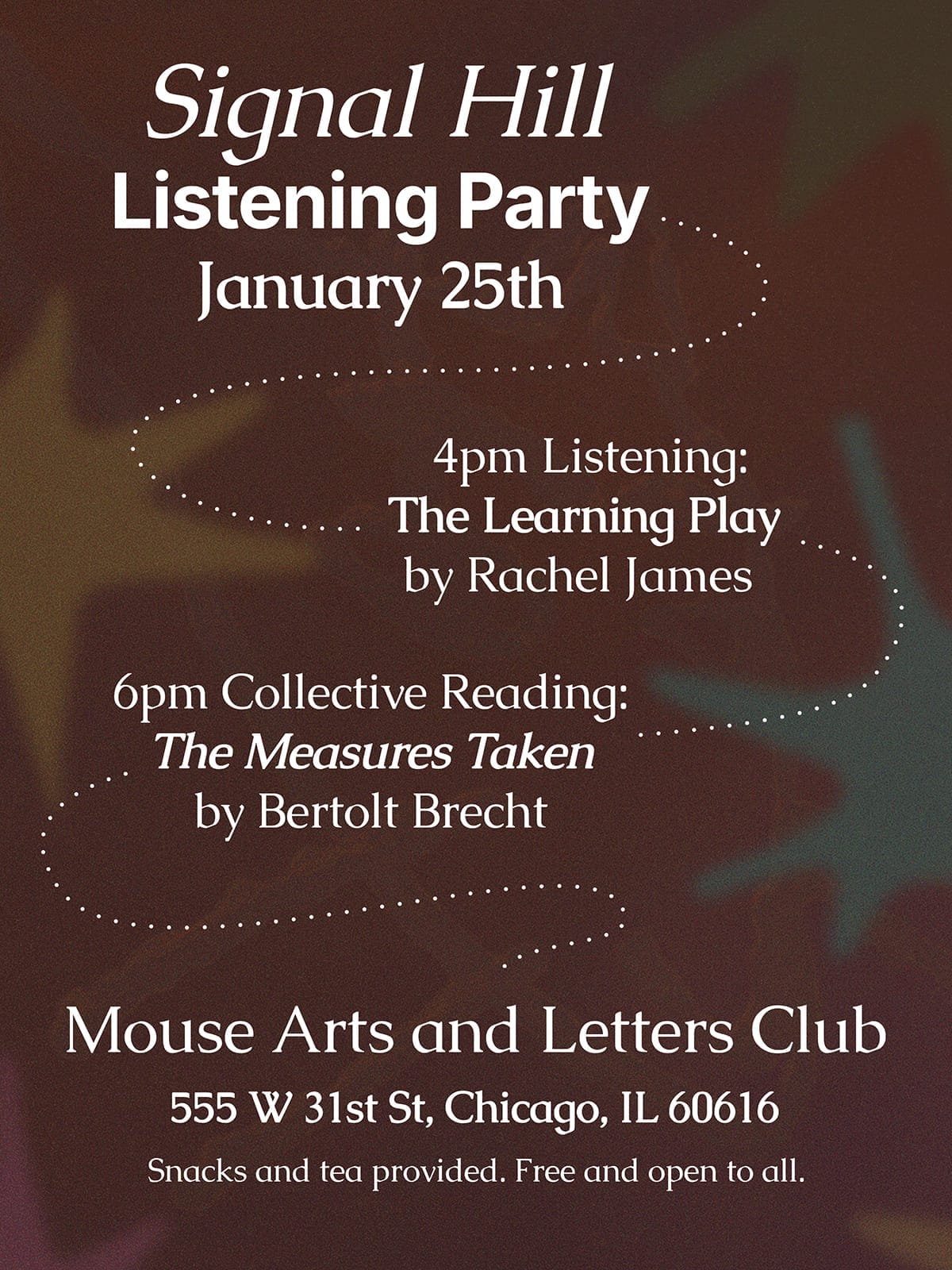 "At 4pm, we’ll listen to Rachel James’ story from the second issue of Signal Hill: “The Learning Play,” After we listen to Rachel’s story, we’ll pause for tea and snacks, and then (for those brave enough), hold a collective reading of The Measures Taken."